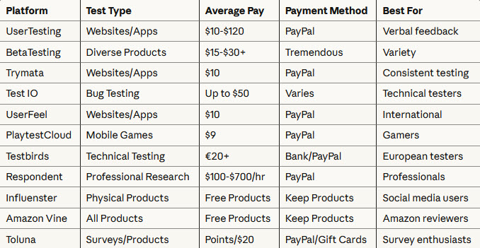 Survey platforms such as Survey Junkie, Swagbucks, or InboxDollars are great sources for additional income one can get between test sessions. Cashback and reward programs, such as Rakuten or Honey, are good sources for starting your passive-income journey through the purchase of everyday goods. Content creation through blogging or social media about your testing experiences. Market research paying and focus groups as a source of high-paying, occasional, and time-limited opportunities. Online tutoring or consulting via your professional expertise demonstrated through testing profiles.
